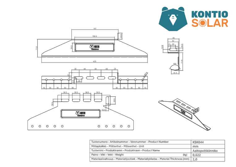 Kontio Solar aaltopeltikiinnike tarjoaa kestävän ja tiiviin ratkaisun aurinkopaneelien asentamiseen aaltopeltikatoille. Kiinnike on valmistettu S350GD+ZMA-kuumasinkitystä rakenneteräksestä, jossa magnesium-alumiinisinkkipinnoite takaa erinomaisen korroosiosuojan ja pitkäikäisyyden. Lisäksi tuotteessa hyödynnetään EPDM-eristystä, joka parantaa asennuksen laatua.