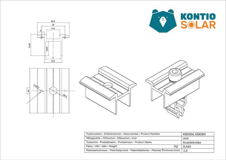 Keskikiinnike on suunniteltu aurinkopaneelien helppoon ja kestävään kiinnitykseen Kontio Solar profiilikiskoon. Sen voi painaa suoraan kiskoon, liu'uttaa haluttuun kohtaan ja kiristää ruuvilla, jolloin paneeli lukittuu tukevasti paikalleen.