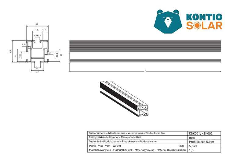 Kontio Solar profiilikisko on aurinkopaneelijärjestelmän keskeinen osa, joka varmistaa turvallisen ja kestävän asennuksen. Tämä Kontio Solarin omaa suunnittelua oleva kisko on yhteensopiva sekä Kontio Solarin että Oriman kattokiinnikkeiden kanssa. Sen yläpuolelle voidaan asentaa Kontio Solar -paneelikiinnikkeet.